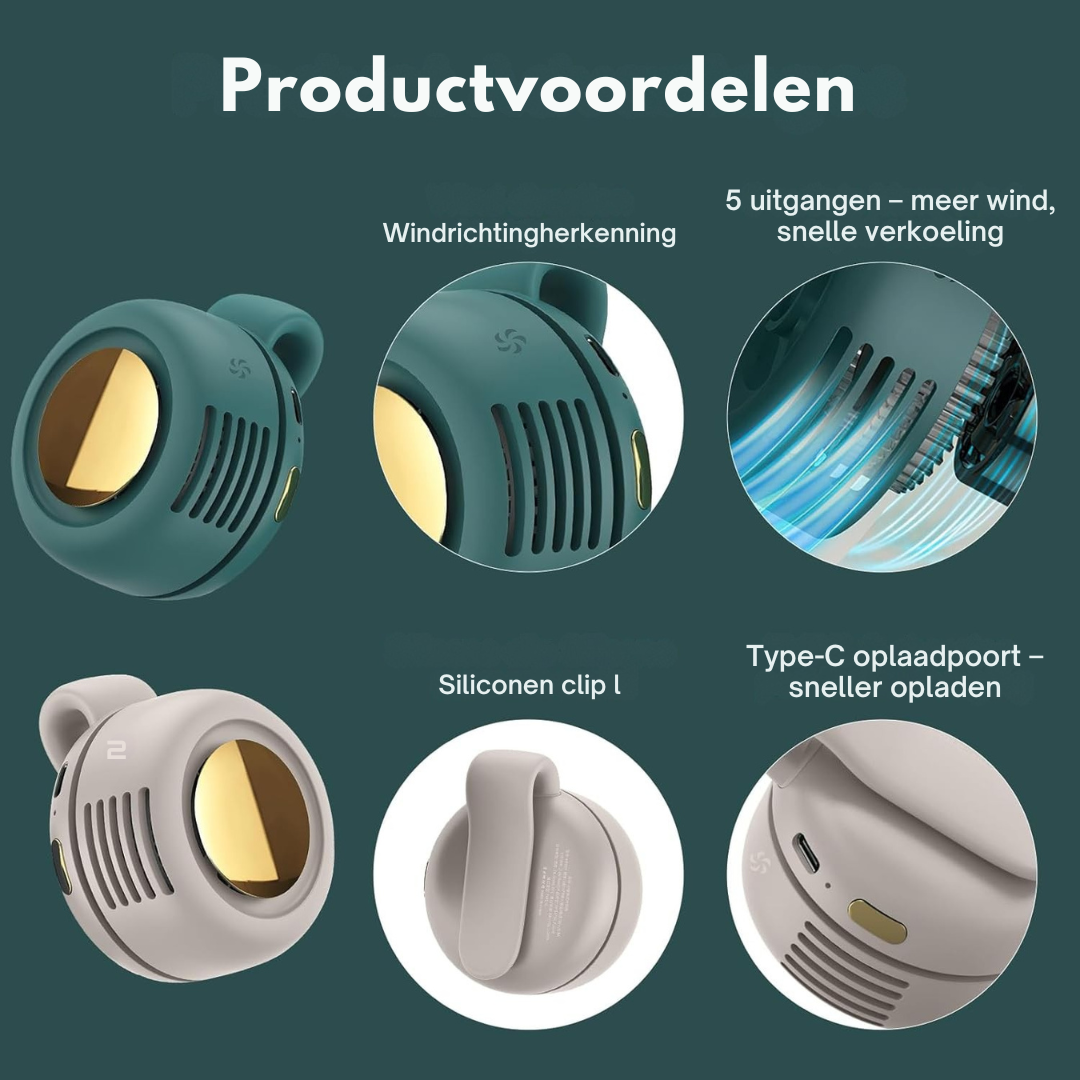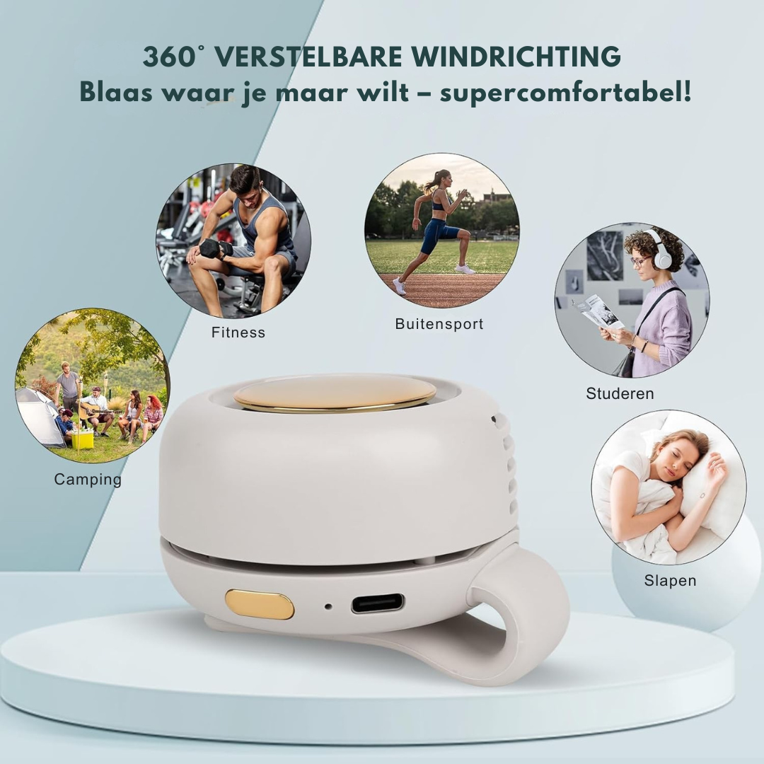 Heb je het vaak benauwd tijdens het reizen, wandelen, sporten, winkelen of zelfs in huis? Voel je je snel oververhit en verlang je naar directe verkoeling – zonder gedoe? Airclip is jouw oplossing! Deze slimme mini-ventilator klik je met één beweging aan je kleding, tas of riem. Met 360° rotatie en 3 snelheden geniet je overal handsfree van een stille, verfrissende bries. Of je nu onderweg bent of thuis – Airclip zorgt altijd voor directe verkoeling.