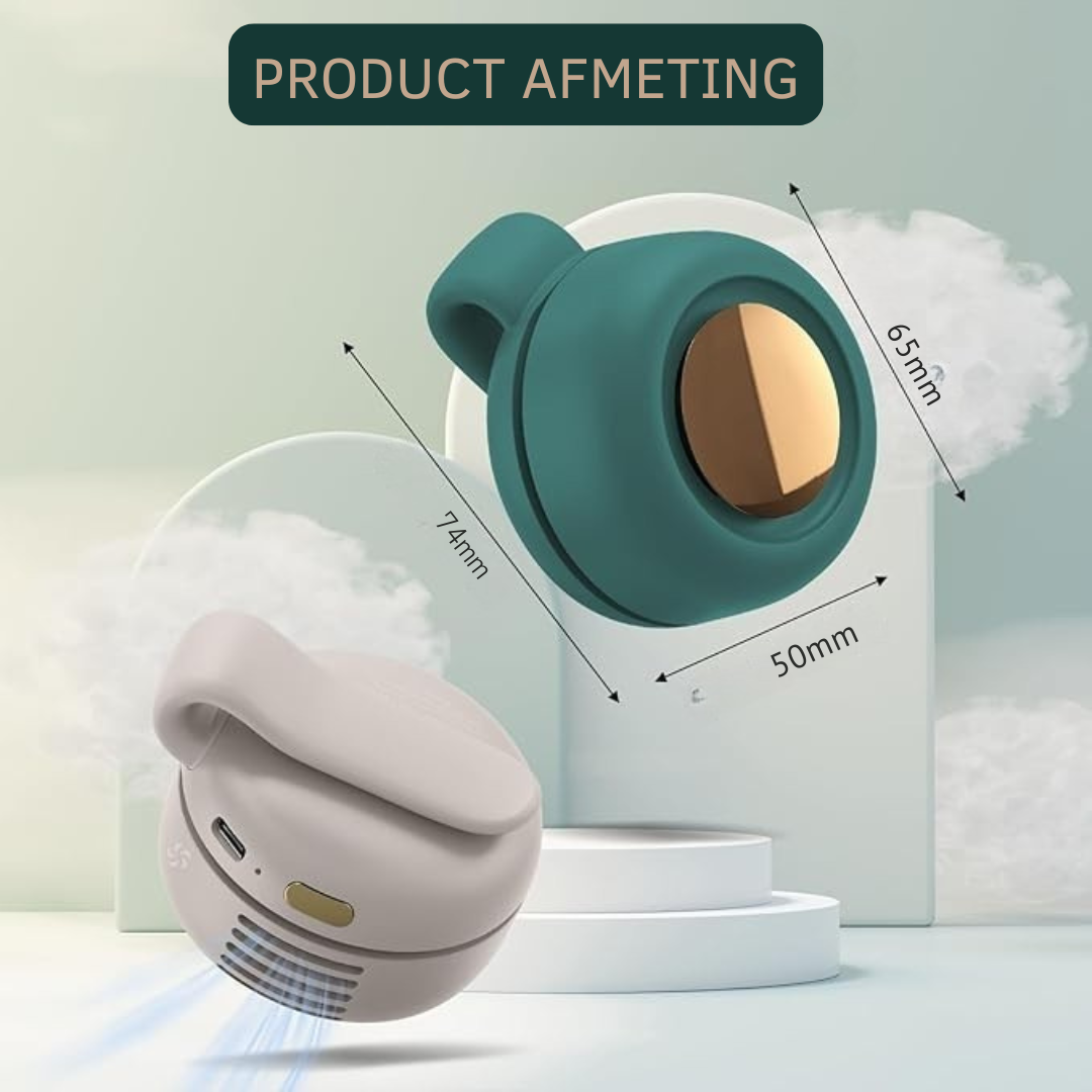De Airclip meet slechts 7,4 cm x 6,5 cm x 5 cm – klein genoeg om overal mee naartoe te nemen, maar krachtig genoeg om je direct te verkoelen.