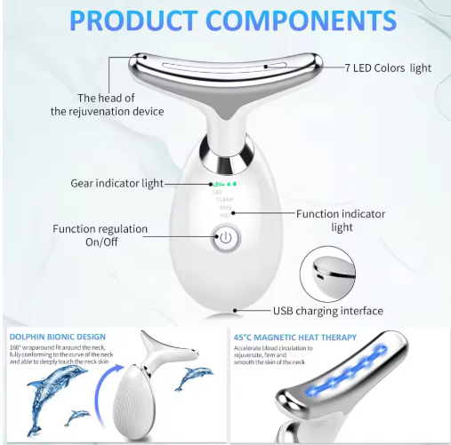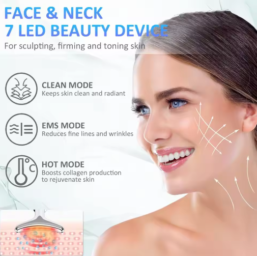 Maak dan kennis met de 7-in-1 Gezichtsmassager, ontworpen om je huid te reinigen, te ontspannen en te verjongen. Dit multifunctionele apparaat biedt 7 verschillende LED-lichtmodi, elk met een specifieke huidverzorgingsfunctie.